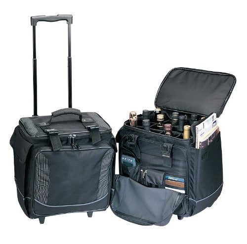 Details: Product features – 1. Made of 600D polyester with tech dot trim. 2. A perfect piece for beverage/winery sales representatives. 3. 12 separate sections, 6 permanent and 6 detachable, can be used as a cooler. 4. The 6 detachable section is adjustable allowing you to accommodate bottles of various sizes. 5. Completely foam padded, soft grip handle, locking pull handle and inline skate wheels. 6. Front organizer to hold tablet, calculator, cards, pens and incidentals. 7. Dual side pockets with flap Velcro closure.