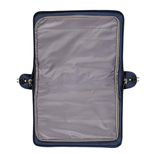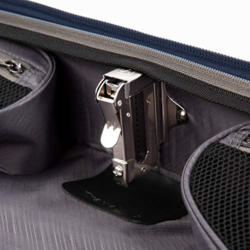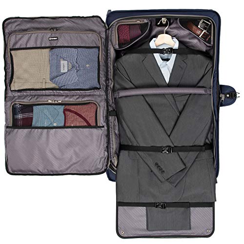 - Extension panel accommodates longer dresses and suit jackets. Metal hanger clamp helps secure hanging garments. Large zippered panel pockets and corner accessory pockets provide packing flexibility