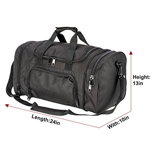 Details: This medium size bag is roughly 10 inches wide and in depth. The overall length is 24 inches. Large areas on the sides and top flap are ideal for embroidering or printing with your favorite insignia or logo. The front accessory pocket provides a wide but shallow space for smaller devices and items. The side compartment offer more room for smaller items that need separation for the main compartment. The main compartment is large and offers mildew resistant wipe-down material for longevity and strength over a lifetime of use. If you are looking for a quality gym bag or carry-on for flights, this bag will give you years of service.