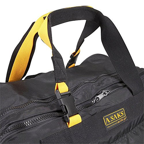 Details: Material: Nylon Size: 14" x 21" x 13" External Description Lightweight, yet durable 420 Denier Nylon. Two carry handles can connect to each other to convert into a should strap. Front zippered pocket and open back pocket to get to things quickly. Internal Description Interior is divided into 2 separate compartments - each has it's own zippered opening. Each compartment expands an extra 2 inches for added packing capacity. Adjustable tie-down straps hold packable in place Colors: Black/Yellow