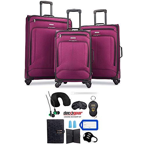 - BUNDLE INCLUDES: American Tourister Pop Max 3 Piece Luggage Spinner Set 29/25/21 Berry - Deco Gear Luggage Accessory Kit 10 Piece Ultimate Travel Bundle