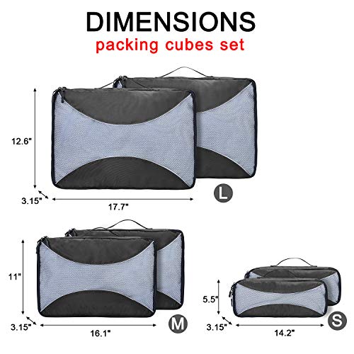 - ✈ 6 Set Packing Cubes: 2 x L (17.7*12.6*3.15inch); 2 x M (16.1*11*3.15inch); 2 x Slim (14.2*5.5*3.15inch). Different sizes to fit in your luggage. Keep your clothes in place and organized as well as not shift in the luggage.