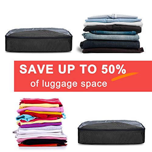 - ✈ Effective Packing in luggage. Save your space with this 6pcs travel organizers set that compartmentalize and classify similar size items to streamline packing, utilizing interior luggage space to the fullest. Pack smart and save space with compression pouches to fit in your suitcase or carry on bags.