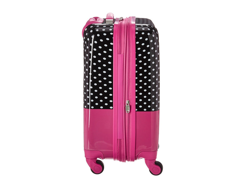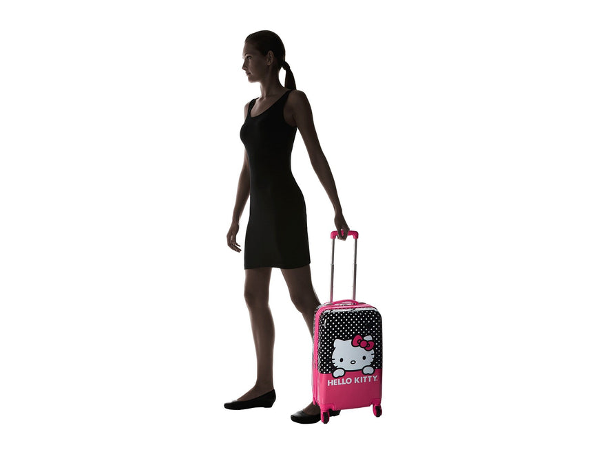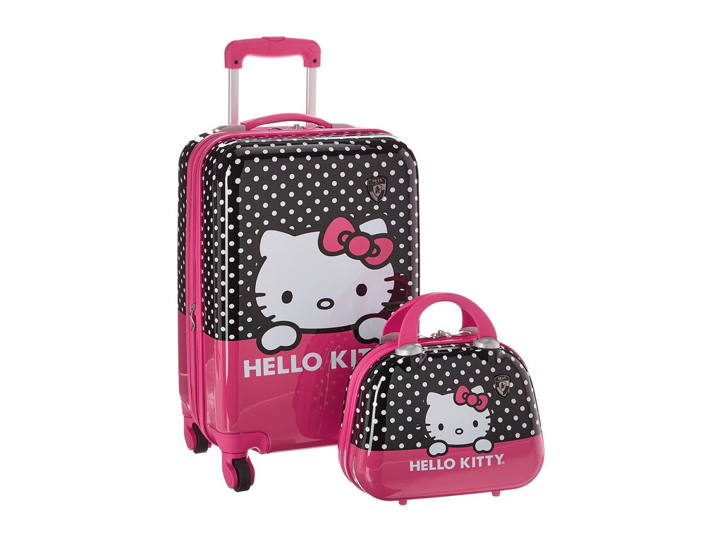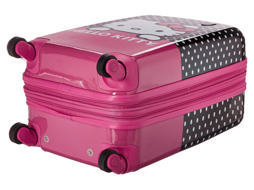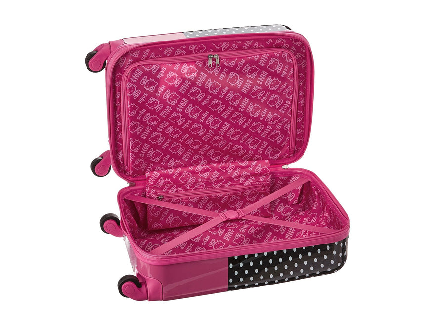 Details: The Hello Kitty hard-sided luggage 2 pc. set includes a 21' expandable luggage piece and a hard shell beauty case. Both luggage and beauty case features a lovely print of Hello Kitty on the front and back surfaces. The 21' luggage allows for more packing space due to its zipper release expansion system, while still remaining lightweight. Its four spinner wheels spread the weight evenly allowing for smooth and effortless mobility on different terrains. The beauty case has an elastic strap built on the back that allows for easy attachment to the luggage, the interior comes with a built-in mirror and divider.