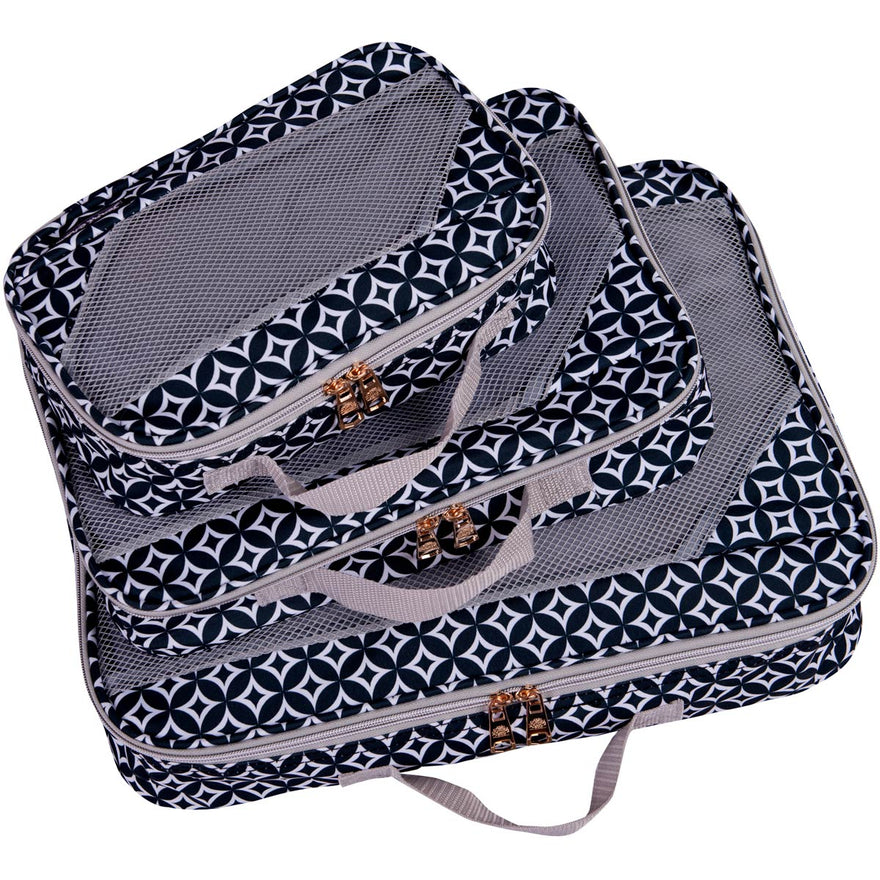 Jenni Chan packing cubes consists of three different sizes for keeping your multiple personal items organized, easy to use full opening zippers and mesh top see through ventilation.