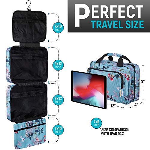 - ✅ REAL LARGE SIZE HANGING TRAVEL MAKEUP BAG: 12" x 9" x 4" WITH PRACTICAL DESIGN. You can easily fit standard size toiletry bottles into it. This nice looking and very practical makeup bag comes with: comfortable top carry handles, one front big size zippered pocket, top zip closure, three large transparent zippered compartments, and one, practical, detachable pouch and steady metal hanger.