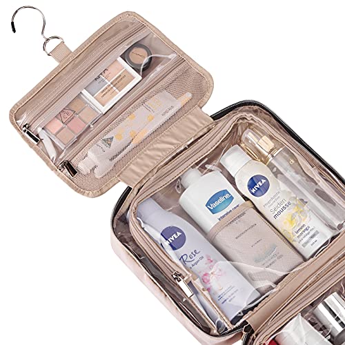 • EASY TO GRAB-Special U-shape zippers design, take out the toiletries or zip up the toiletry case quickly. Multiple pouches and elastic bands. No more unpacking or digging through one bag and laying your stuff out on the bathroom counter. Just hang the bag up, grab what you need and put it back in the bag