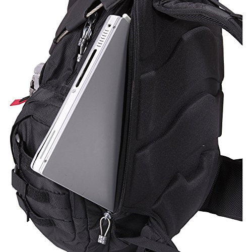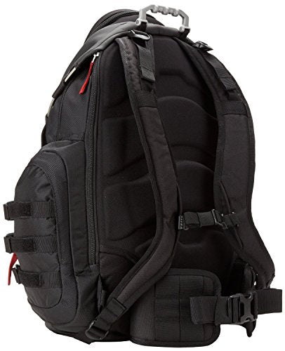 Details: Large sized backpack with lid style opening, single panel main compartment, padded computer panel with side entry, two side pockets and front organizer panel