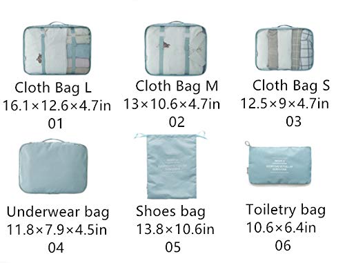- High Capacity :1.clothes bag L:10-12 shirts;2.clothes bag M:6-8 shirts;3.Clothes bag S:4-6 shirts;4.bra underwear bag:for bra underwear and socks;5.shoe bag:1 pair of slippers and 1 pair of sneakers;6.toiletry bag:for your toiletry accessories.personal cosmetics and electronic Accessories.