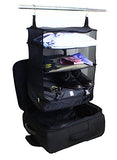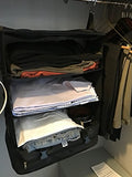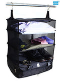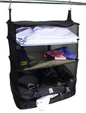 Details: Save space, stay organized, keep clothes wrinkle-free and clean! Make packing and unpacking easy and efficient! 3-tiered portable shelving & travel organizer with high strength steel hooks keeps clothing tidy and pressed during travel. Compartments for clothes, underwear, shoes, and dirty cloths. Just hang; load; collapse & latch; Stow-N-Go. Makes unpacking a breeze and acts as a portable shelving system when you travel. Hangs in closet or on shower curtain rod. Made from lightweight, but durable polyester fabric. Fits 20" and larger suitcases. Saves up to 30% of the available space in your suitcase. Zippered compartment at the bottom helps seperate clean clothes from dirties. Patent Pending Design. Measures 17.7" x 11.8" x 25.2".