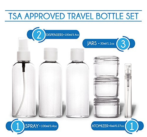 - ✅ DETACHABLE CLEAR BAG + TRAVEL BOTTLE SET - Includes detachable see-through Clear Bag (33.8 oz) + 7 leak-proof Travel Bottles to fill up your own cosmetics (3.4 oz max.) | TSA Approved | Carry it in your hand luggage on flights