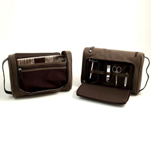 Details: The Brown Ultra Suede Leather Travel Toiletry Bag With 5 Piece Manicure Set is the ideal gift for holidays, weddings and anniversaries. The brown leather toiletry bag features a fold-out design, spacious compartments, hanger and zippered closure. This durable bag holds a five-piece manicure set and other grooming tools. The Brown Ultra Suede Leather Travel Toiletry Bag With 5 Piece Manicure Set can be engraved with a name or special monogram. Surprise your favorite guy with this travel set by clicking add to cart. Measures at 11"W x 3.5"L x 7.25"H.