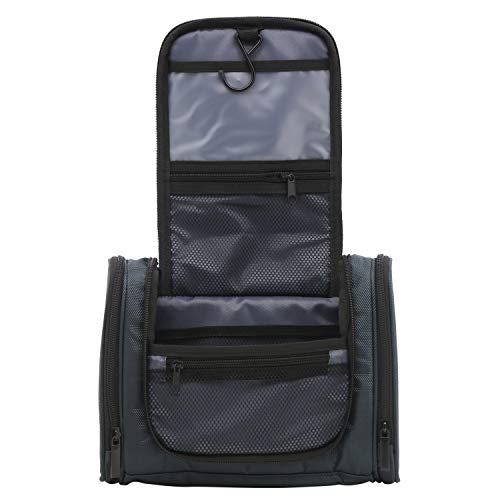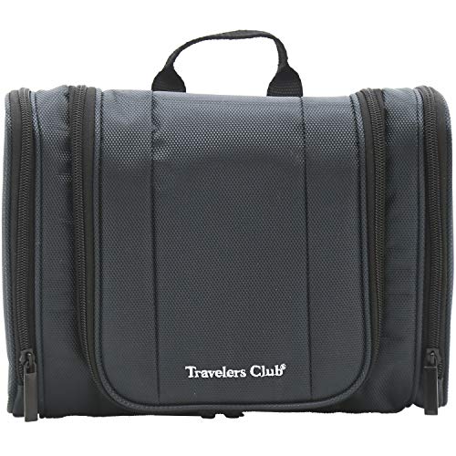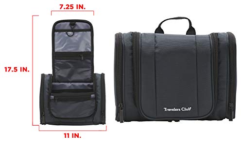 Details: Travelers Club 11" Toiletry case travel accessory kit volume capacity: 2Lopen Dimensions: 17. 5" H x 11" L (bottom compartment) x 7. 25" L (top compartment) x 3. 3" Product weight: 1 lb. Product material: 1680D. Polyester - The strongest and most durable material in business includes hook for hanging. Perfect to place in bathroom, closet, or standing hanger while traveling. Contact manufacturer, not retailer, directly for any customer service inquiries