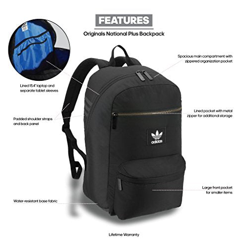 Details: the adidas Originals national plus backpack fuses tradition with athletic details through premium materials. The water resistant body material and dual density tricot lined back panel and shoulder straps provide durability and protection. Additional features include one large main compartment for all of your essentials, two smaller compartments to keep your smaller items organzied, a laptop/tablet sleeve with protective lining and a woven label trefoil patch. Lifetime warranty- built to last.