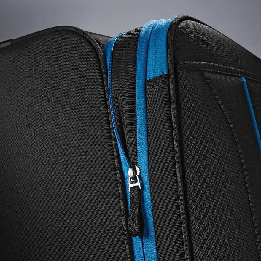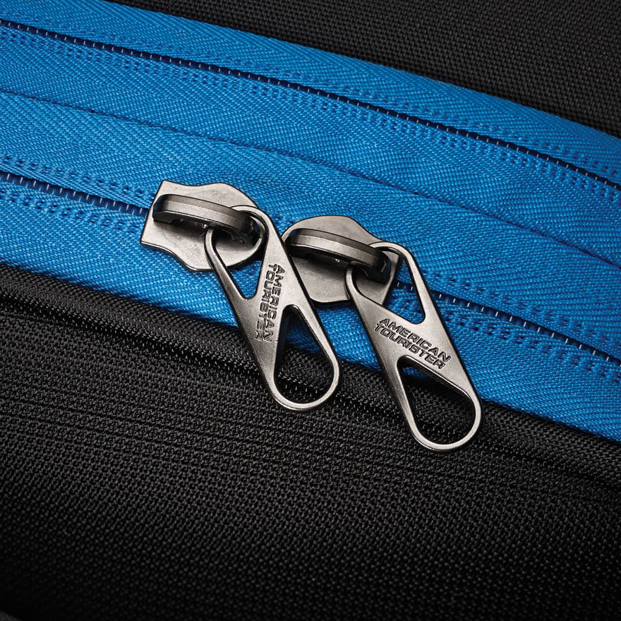 - Color-matched embroidered logo and reversed zippers with the American Tourister logo on the zipper pulls.