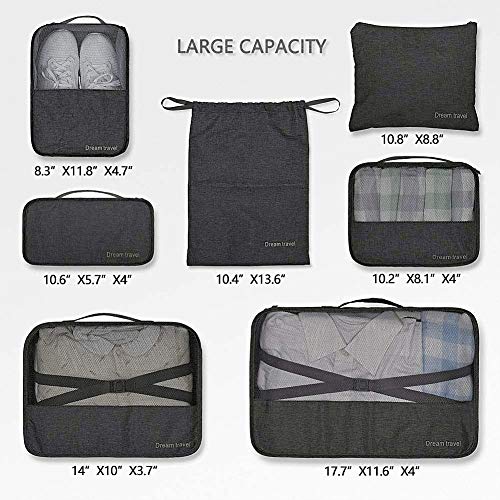 - LARGE CAPACITY: Garment cubes 17.7"x11.6"x4", 14"x10"x3.7", 10.2"x8.1"x4". Underwear bag 10.6"x5.7"x4". Shoe bag 8.3"x11.8"х4.7". Flat bag zipper 10.8"x8.8". Laundry bag 10.4"x13.6"