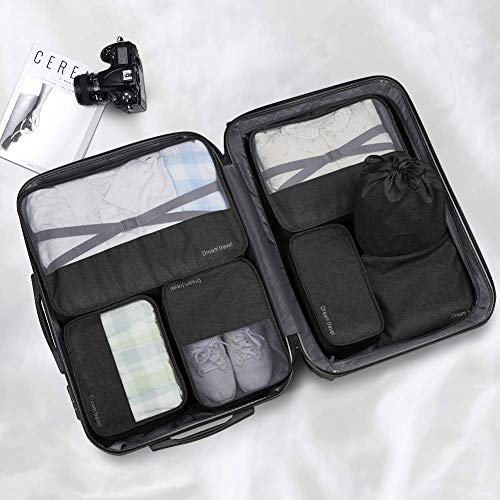 - USE 7 items: 1. Big mesh cubes:10-12 shirts 2. Middle mesh cubes: 6-8 shirts 3. Small mesh cubes: 4-6 shirts 4. Underwear bag: for bra, underwear and socks 5. Shoes bag: It is not just a shoe bag. It can also be used as makeup bag, toiletries bag, clothes package and for other uses. 6. Flat bag zipper: for your toiletry accessories, personal cosmetics or electronic, 7. Laundry bag: help to separate your dirty clothes at the end of the trip