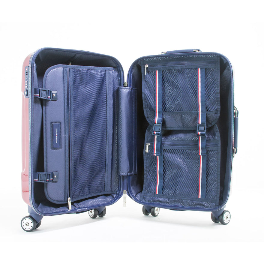 The Tommy Hilfiger brand has become a symbol of the all-American spirit and continues to be regarded as one of the most recognized global lifestyle brands. This material is extremely lightweight and durable. Spinner wheels rotate 360 degrees for easy maneuverability. Modern aircraft aluminum trolley system with push button handle, interior mesh and zip pocket.