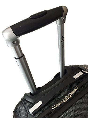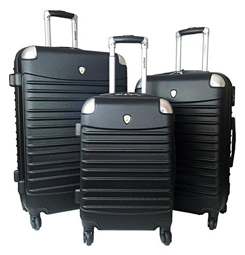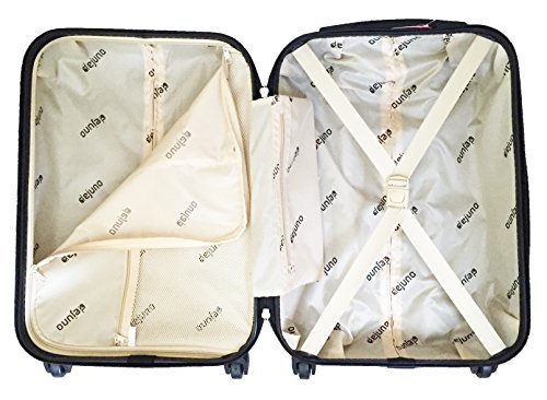 Details: All 3 luggage pieces are same in aesthetics but differ in sizes. ABS material gives outer shell rigidity and durability. High quality aluminum telescoping handle system expands with push button. 2 padded handles on top and side. 4 dual 360 degree spinner wheels. Inside compartment has beige lining, 2 straps, toiletry pouch, and 1 zipper pocket. Inside has zipper flap that can be used to separate the main compartment into 2 areas. Main compartment can be locked(locks included). 2 smaller cases fit into the largest one.
