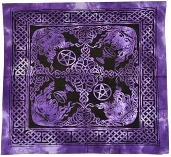 Details: A cotton tote bag with Celtic knot work and Wiccan symbols. Purple background color is tye-dye and will vary. 100% Cotton. 18" x 18"