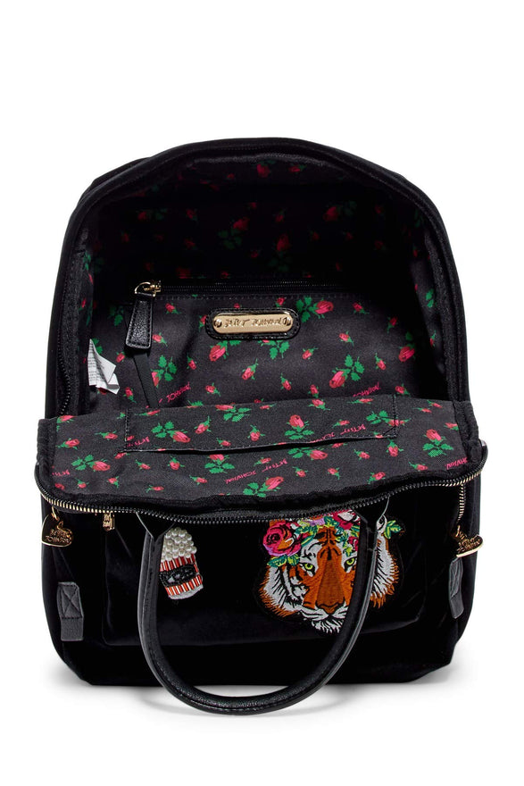 - A plethora of whimsical Appliques of Popcorn, Cherries, Lips & Lion embellishments confirm that this Betsey Johnson's iconic style is a very edge trendy velvet backpack