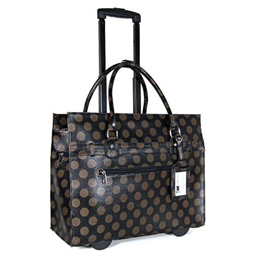 Details: Fashion on wheels: this airplane carry-on size executive roller brief, a polka dot printed beauty, is fitted for the working, traveling woman who appreciates the smart and unconventional, offering space, structure and style. Featuring: top zip closure; padded compartments for a 15.6 inch laptop and an electronic tablet or reader; retractable handle; rollerblade wheels; coordinated id tag; inside organizer compartments for cards and pens; inside id defender zipped pocket; 2 side and 1 front exterior zipped pockets. Exterior dimensions: 17 inch wide x 14 inch high x 7 inch deep.