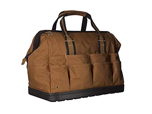 Details: Complete your list of repairs with this Carhartt® 18" Legacy Tool Bag w/ Molded Base. Sturdy synthetic fabrication with Rain Defender® durable water repellent (DWR) for keeping your gear dry in light rain. Triple needle-stitch construction. Adjustable and removable strap. Rugged haul handles. Large, zippered main compartment. Twenty-eight exterior pockets and loops. Sixteen interior pockets. Internal metal frame allows for easy access and prevents the bag from collapsing on itself. Molded, load-bearing, abrasion-resistant base. Imported. Measurements: Bottom Width: 18 in Depth: 11 in Height: 14 3⁄4 in Strap Length: 51 3⁄4 in Strap Drop: 25 1⁄2 in Handle Length: 17 1⁄2 in Handle Drop: 3 1⁄2 in Weight: 5 lbs 10 oz