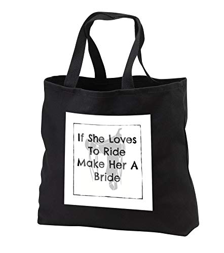 Details: Image of If She Loves To Ride Make Her A Bride Tote Bag is perfect for school, errands, or trips to the beach. Custom image affixed to durable, heavy-duty 100% cotton twill with duel cotton twill handles. Jumbo tote available in black only. Standard tote available in denim and black.