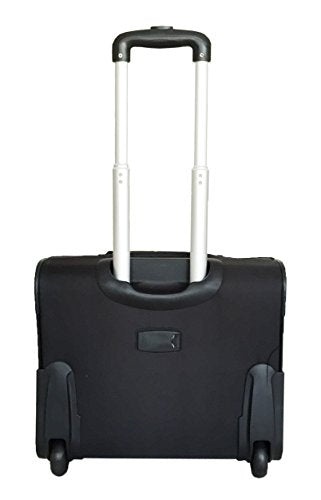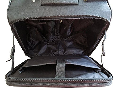 Details: High quality aluminum telescoping handle system expands with push button. 2 Large Durable Wheels. Padded handle on top. Inside: large compartment has 2 straps and attached laptop compartment (dimensions: 10" L x 14.5" H x 2" W). Id tag in back. 2 pockets in front and 1 has a divider. High Quality Construction.