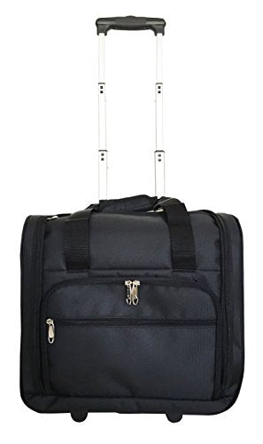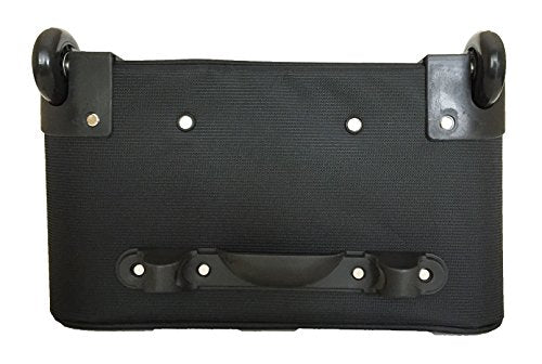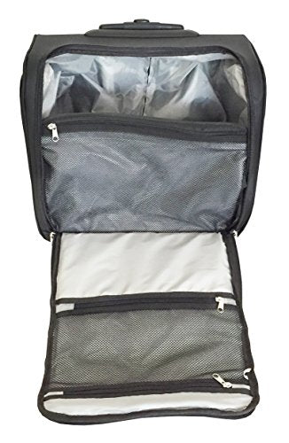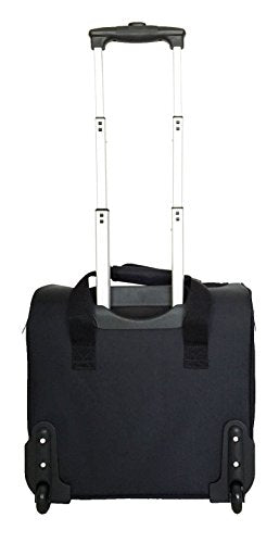 Details: High quality aluminum telescoping handle system expands with push button. 2 Large Durable Wheels. Handle on top. Inside: large compartment, 2 flaps with zipper pockets and netted pockets. Multiple side and front pockets. High Quality Construction.