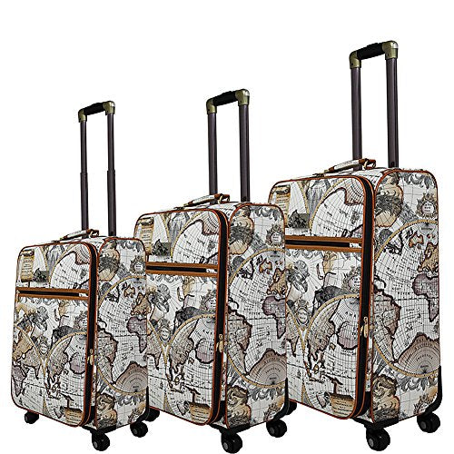 Details: Web exclusive! Jetsetters will love the look of this 3-piece luggage set from Chariot's Map collection. A colorful image of the world on the front combined with faux leather trim gives each spinner a luxe appearance. Details that offer travel convenience include the telescopic handle and 360° spinner wheels for effortless portability, a TSA-approved lock attached to each piece for added security and an expandable design for extra packing capacity.