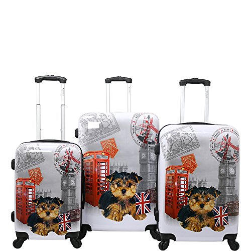 Details: It will be easy to spot your luggage on the baggage carousel when you're on the go with this adorable three piece spinner set from Chariot. The Chariot UK 3Pc Hardside Spinner Set is constructed from durable ABS material and includes three separate cases that measure 20, 24, and 28 tall. Each case is detailed with a push-button telescoping handle system, spinner wheels that offer multi-directional mobility, and top and side carry handles for easy lifting. Accented with a built-in TSA lock, each case is expandable and detailed with a fully lined interior with tie-down garment straps and zippered pockets for organization. The Union Jack flag, puppy, and London graphics add eye-catching charm and personal style.