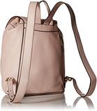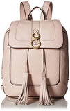 Details: Durable pebble leather backpack featuring brass ring hardware, rivets, interior tech pockets, and tassels; details: 1 interior zip pocket, flap with magnetic closure and drawstring opening, rear zip entry to main compartment; dimensions: 10 x 14 x 5.5