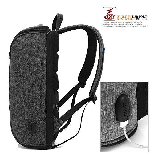 Details: CoolBELL bases on the cutting-edge of fashion trends. Pursuing the best quality of laptop bag category and devoting to providing the best product and service to customers. We make every effort to achieve the best in every detail of design, color, material, sewing, sales and service USB 2.0 Charging port design Built-in USB cable. Use it to connect the power bank, then connect your phone with original USB cable to the USB port, you could charge your phone conveniently. Personality design Personality design provides a newest and unprecedented experience. You won¡¯t regret to get it. Foldable design With a long main zipper, this backpack can be foldable if you want. Unzip the zipper, you could fold it to a luggage, good helper for your trip. Luggage Belt design A luggage belt been added to the back of the bag, so convenient function for fixing the bag to a luggage trolley. Still, an ant-thief pocket been added for keeping precious items. Dimensions:17.3 x 13.5 x 5.5 inches; Fits up to 15.6 inches laptop. Weight:2.2 lb Color: Grey Black Construction: Independent laptop compartment.Special design laptop compartment provides more protection for your laptop. Side zipper. Thick foam padding provides shock-proof function. Functional Accessory compartment: Designed for keeping laptop accessory like power cord, mouse etc, books, documents, iPad etc, something other daily use items you want to carry. 13 pockets inside helps you keep varies items you want to carry. Using occasions : School life, Business, working, weekend, trip etc.Classical joker. Warm tip: Please do not worry about the no poisonous material smell with the bag when you receive it, the smell will disappear in a airy place for a while.