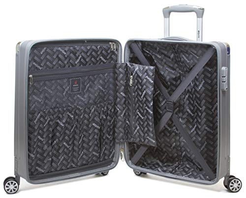 • Expandable scratch resistant polycarbonate shell and luxurious grey fabric interior with zippered divider, built-in TSA combination lock, deluxe 8-wheel spinner wheels and telescopic handle