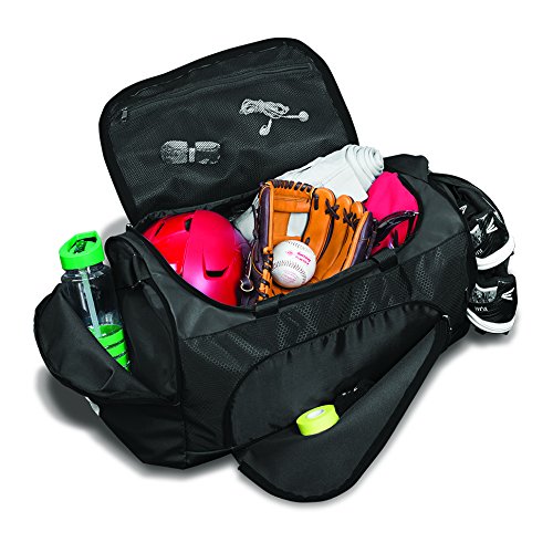 Details: The E310D Player Duffle is used by Easton's elite college teams across the country. It keeps you game-ready with a pair of bat sleeves with flip-down locking zippers, multiple side pockets for gear and personal items, a separate side pocket for cleats or shoes, and vented pockets that minimize odor and allow equipment to dry faster. An adjustable and padded shoulder strap and shorter handle carry straps keep things comfortable and ergonomic. The Player Duffle also features a removable panel for custom team embroidery