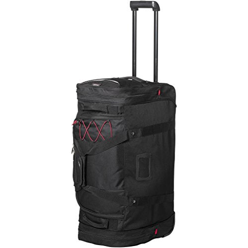 Details: Proton wheeled duffel bag. Wheeled duffel with zipped main compartment with U shaped opening. Front top nylex lined media pocket. Large zipped front pocket includes removable techtrap organizer panel and pocket organization. Two large gusseted pockets include an extended interior shoe pocket. Additional exterior side zipped pocket. Elastic shock cord on top panel for maximum storage. ID window on back. Recessed, telescoping handle and inline skate wheels with corner protectors. Molded side grab handle with neoprene padding, two top webbed grab handles, and main handles made of durable webbing with a comfortable handle wrap. Signature elleven lining and hardware. Dobby nylon and scuba. Compliances: Cadmium tested.