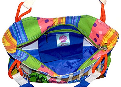 Details: Nothing says summer at the beach like a great pair of flip flops. Paul Brent captures this feeling with his Flip Flop line of tote bags. This medium scoop tote features brightly colored flip flops up against a white picket fence. Made from heavy canvas and featuring a unique carry handle this design is ready for the beach. Each bag includes two gusset pockets one on each end and a small zippered pocket on the inside. The top has a heavy zipper closure to round out the design.