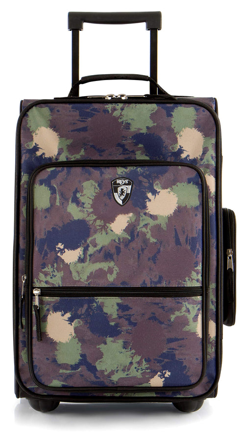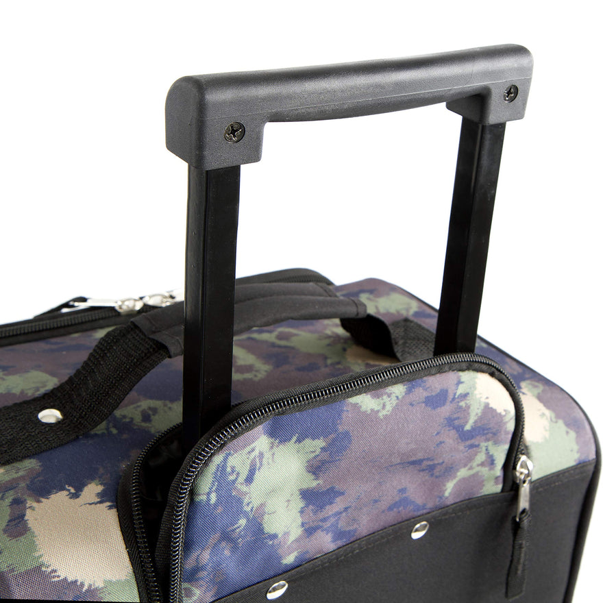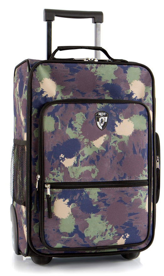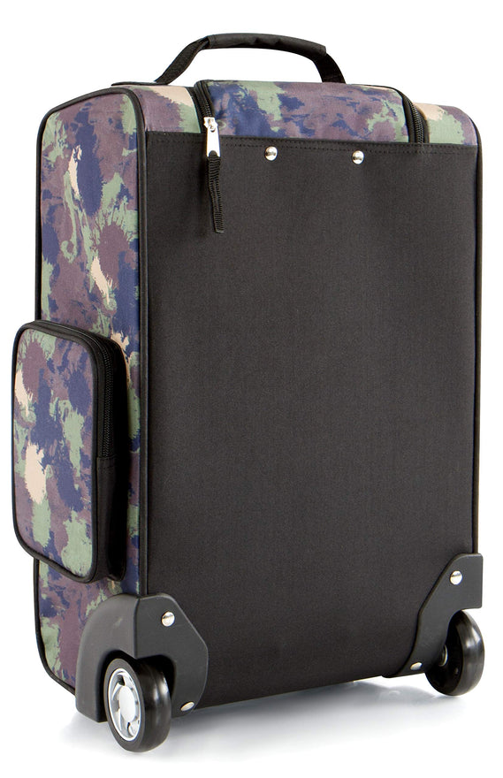 Details: This fun camo print 18-inch luggage makes traveling easy- it can be used as a carry-on or as checked luggage. This luggage features 1 main zippered compartment as well as smaller zippered compartment and mesh pockets. The luggage has a 14-inch re-tractable trolley system and 2 in-line skate wheels for easy movement.