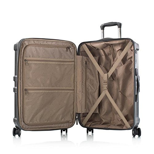 Details: The Commander Expandable 26" Spinner from Heys America® is lightweight and sleek! Made of polycarbonate composite. Internal handle system made from lightweight aluminum. Top and side carry handles for ease and comfort. Fully lined. Interior features a compression strap, four mesh zip compartments, and a zip divide. Zipper-released expansion system allows for an extra 20% in packing capacity. Built-in TSA lock. Four swivel wheels allow 360 degree rolling for perfect control. Imported. Measurements: Width: 16 in Depth: 11 1⁄2 in Height: 25 1⁄2 in Weight: 8 lbs 15.4 oz