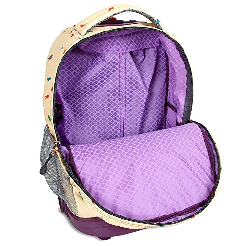 Details: Rolling Backpack - J World New York sunrise model comes with an aluminum handle which is recessed and locking, polyurethanecoated fabric and pockets galore for organization. Pens, pencils, credit cards, and keys all have a space designated in the organizer pocket and in the bigger outer pocket wallets and other valuables can be stashed. The main compartment is big enough to carry textbooks and notebooks and the mesh water bottle pocket keeps you cool and refreshed throughout the day. Backpack - Our most basic backpack comes with an upgrade. The oz backpack comes in a variety of prints that will make you look very fashion forward. The backpack is lined on the inside and also has side pockets for water bottles. The straps are ergonomically s-shaped and padded.