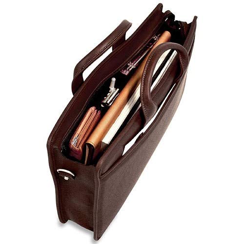 Details: This single gusset top zip briefcase is hand crafted from American steer hide that is known for its strength and durability. our Easy Access Organizer shoulder strap satin nickel hardware open side pockets durable ballistic lining back strap for attachment to luggage Available in black and brown Dimensions: 16 1/2" x 11" x 3" Metric: 14.9 x 27.9 x 7.6 cm