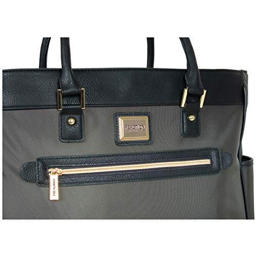 Details: Stroll in style with this Kenneth Cole Reaction ‘Runway Call’ nylon-twill single compartment top zip wheeled 17” laptop & tablet Business tote. Compatible with most tablets. Exterior made of a lightweight and durable nylon-twill with Split leather trim Exterior body material and features a fully lined, tear-resistant interior lining. Easy access, front exterior hidden zipper pocket with business organizer featured. Main compartment includes a padded computer pocket, a padded tablet pocket, a zipper pocket and two open top accessory pockets. Padded dual tote style handles with 9” handle drop Features a wrap buckle for easy lifting. Dual in-line skate wheels allow for swift mobility while on the move. Locking retractable handle system recedes into a hidden zipper pocket when not needed and extends to be 41” tall. Rear exterior features a trolley strap that fits over most upright handles for hands free carrying. Molded feet on bottom of tote help support bag while upright. Backed by a manufacturer lifetime limited. Overall size: 16. 0 inch w x 15. 0 inch h x 6. 0 inch D. Laptop compartment Dimensions: 15. 0 inch w x 11. 5 inch h x 2. 0 inch D. Weight: 5. 5 lbs. The perfect fashion-forward 15-inch 2-wheel 17-inch Laptop & tablet Business carry-on tote for professionals and travelers whom value both style and function.