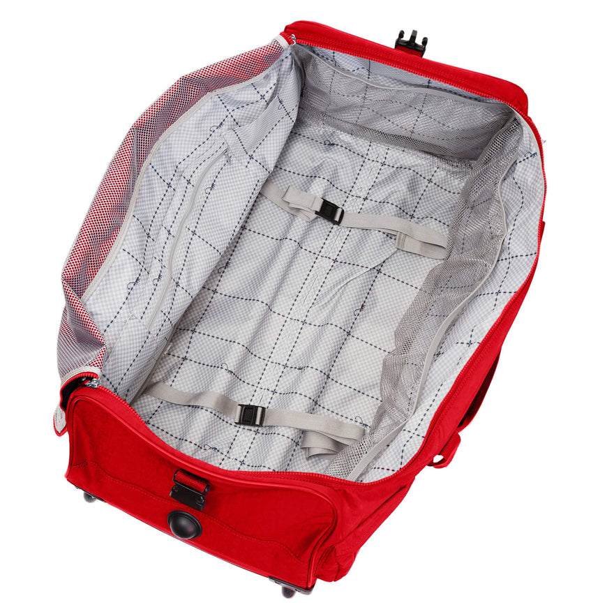 Details: Travel through the airport in style with this lightweight wheeled duffle bag, featuring a collapsible design, two wheels, and a hidden handle for easy rolling. Inside, the discover large rolling luggage features a zip pocket, mesh pouches, and luggage straps will keep everything in place, while soft exterior offers flexibility that allows you to pack far more than you can imagine! adorned in our durable, water resistant crinkle nylon fabric, this large luggage will withstand endless trips through airport baggage claim! plus, our solid luggage and printed luggage options make it easy to spot your duffle in a snap.