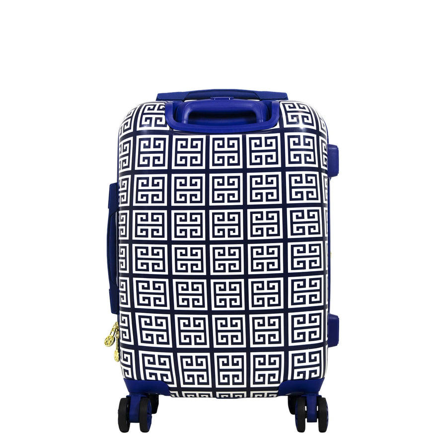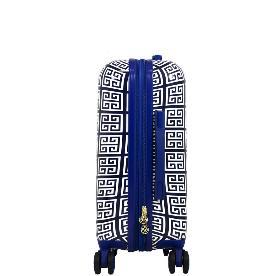 Details: The unique design of the Macbeth collection geo print 21in hard sided rolling suitcase makes it a stylish addition to your vacation. It is made with durable polycarbonate plastic in a jazzy Greek key print. The luggage rolls on smooth, 360 degree multi directional spinners with an aluminum telescopic pull handle in eye-catching gold metallic finish. It has a full body main compartment for all of your essentials with built-in compression straps. It also includes an interior zipper mesh compartment that is perfect for keeping your travel bottles secure. The luggage is easy to load into overhead bins and cars with retractable top and side panel handles. It also has a 2" Expandable zipper gusset that lets you pack more and expands your space. This luggage is functional, lightweight, strong, and easy to spot clean.