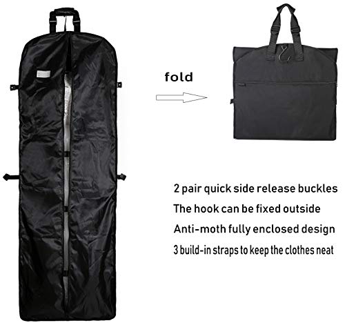 this 60 inches garment bag can be folded into three sections by the side release buckles and Tri-fold design with hand carry handle which made it easy to carry through airports, parking garages, and through hotels.