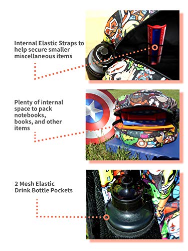 - WELL CONSTRUCTED AND COMFORTABLE - This quality Marvel book bag can be hung up when not in use by the padded handle. This school bag is designed in durable fabric with adjustable foam padded shoulder straps to relieve stress from your child's shoulders, and a padded back for added comfort. The length of the shoulder straps is adjustable for the perfect fit. The side mesh pockets are made from athletic mesh for extra durability. To clean this product, wipe clean with a damp cloth.
