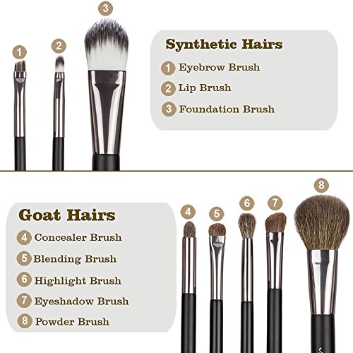 - 5 brushes with top-class goat hair bristles: Goat hairs are curly and scaly, perfect for grabbing powders/minerals, and also much softer than fibers, give you a silky touch on the skin, help you to create a outstanding finish.(Please note that real goat hairs might smell a little different with the synthetic hairs, nontoxic guarantee)