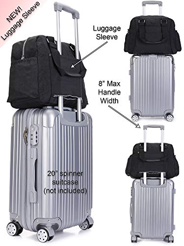 - TROLLEY SLEEVE and slip pocket. On the outside is a large slip pocket on the front for quick access, a zippered pocket directly below, two water bottle pockets on the side and a trolley sleeve on the back for use "piggyback" on wheeled luggage. Trolley sleeve (AKA luggage strap) also doubles as a pocket when not in use. Our tote is CARRY-ON COMPLIANT for airline travel as your personal item and its unstructured design conforms easily to fit underseat or in the overhead compartment.