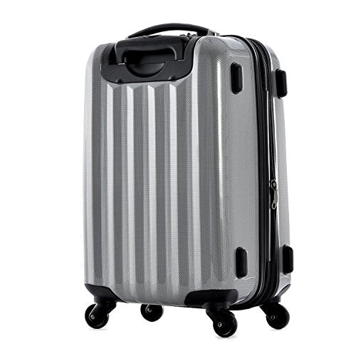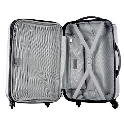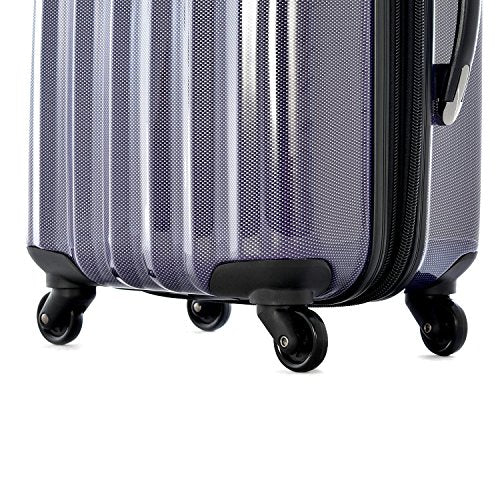 Details: Constructed of durable polycarbonate- 4 wheel spinner allows free movement in all directions- Push button retractable lightweight aluminum handle system- Expandable for additional packing capacity- Interior hanging zippered pocket and elastic tie-belt- Interior divider creates 2 separate compartments for added organization & security- Built-in shoe pockets on 25" mid-size and 29" large-size spinners- Elegantly imprinted fully padded interior lining